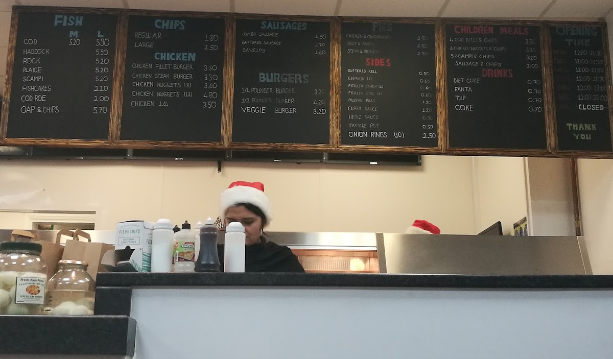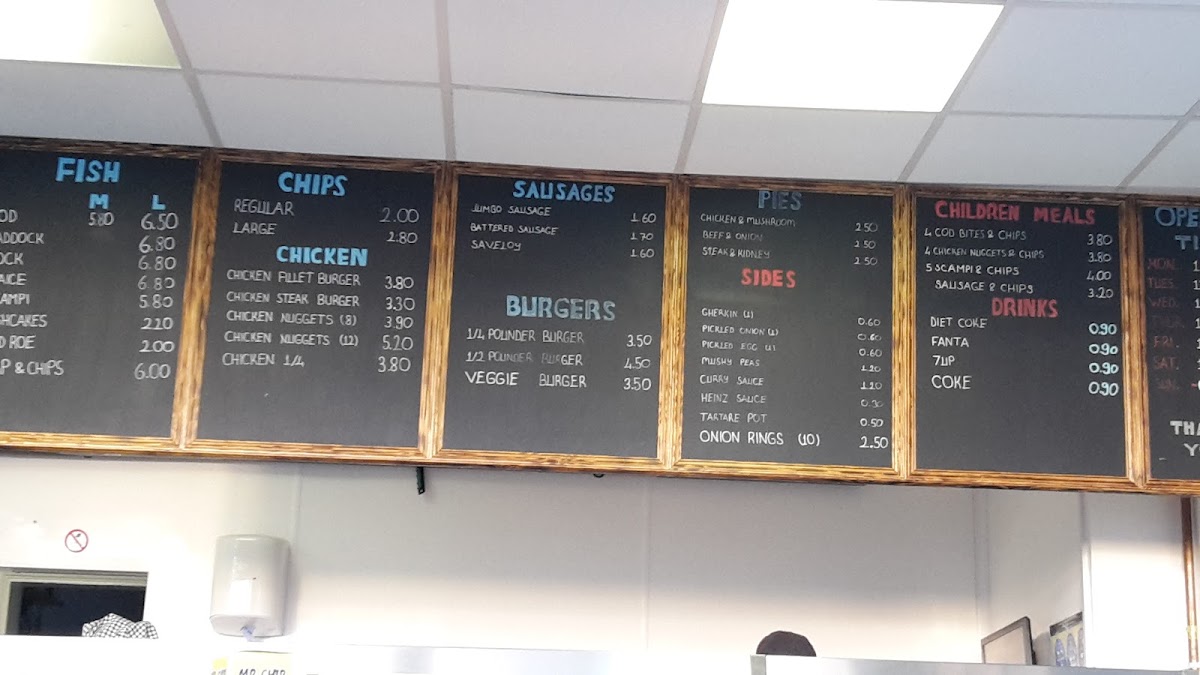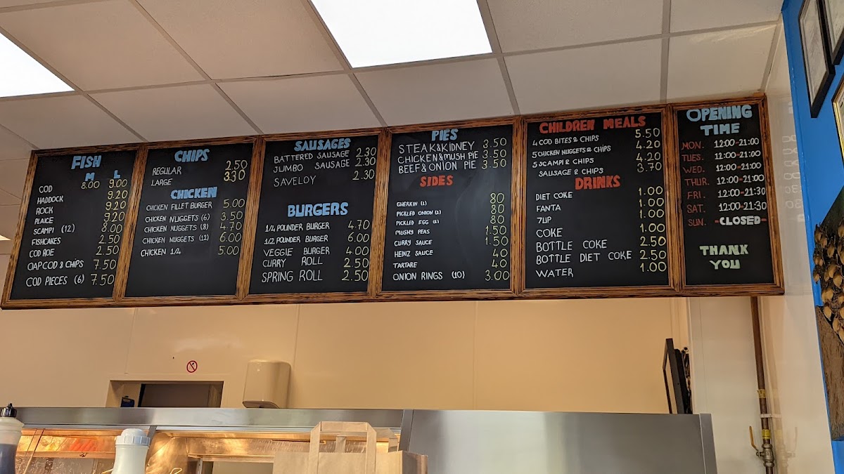The menu at Hardy's Traditional Fish & Chips offers a classic selection of British favorites with a variety of options to suit all tastes. The fish section features popular choices such as Cod, Haddock, Rock Plaice, and Scampi. For those preferring chicken, there are hearty options like the Chicken Fillet Burger, Chicken Nuggets, and the Chicken 1/4. Pie lovers will appreciate the savory Steak & Kidney Pie, Chicken & Mushroom Pie, and Beef & Onion Pie. Children are catered for with meals like Cod Bites & Chips, Chicken Nuggets & Chips, and Scampi & Chips. There’s also a range of satisfying drinks, including Diet Coke, Fanta, and Coke, with bottle options available. For those after something light, the menu features a selection of Burgers such as the 1/4 Polinder Burger and 1/2 Polinder Burger, as well as a Veggie Burger, and crispy options like Curry Roll and Spring Roll. If you're in the mood for something different, try a Sausage or Saveloy, with the Battered Sausage being a popular choice. With such a diverse menu, there’s something for everyone, whether you’re in the mood for fish, chicken, or something a bit more indulgent like a pie or burger.